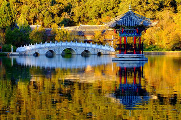 Black Dragon Pool Park: Somewhat idiosyncratically known as Black Dragon Pool, the Jade Spring Park to the north of Lijiang derives its name from the waters which sparkle like jade and are as clear as spring water. The entire park is green with grass and shaded by swaying willow trees. Under the Shuocui Bridge, a waterfall creates a constant roar as it cascades downstream. At the far side of the pool, there are renovated buildings used for art exhibitions, the Moon-Embracing Pavilion with its own white marble bridge across the water, and the Five-Phoenix Temple built during the Ming Dynasty.