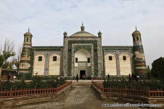 Apakh Hoja Tomb: This Mazar is the holiest place in Xinjiang for the Muslims, and an architectural treasure. Built in 1640, it is reminiscent of the Central Asian artistic style of Samarkand or Isfahan. The site is also known as the Xiang Fei (Fragrant Concubine) Tomb in memory of Abakh Khoja's granddaughter, Iparhan, who was the Fragrant Concubine of Emperor Qianlong of Qing Dynasty. A handsome blue-and-white tiled gate leads into the compound, which includes a small religious school and the Abakh Khoja family tomb. The latter is domed and faced with muti-color tiles. It is the most complete Islamic tomb dating from the beginning of the Qing Dynasty.